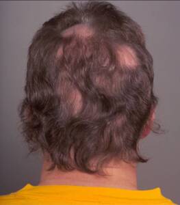 • Some people lose hair in circular or patchy bald spots on the scalp, beard or eyebrows.